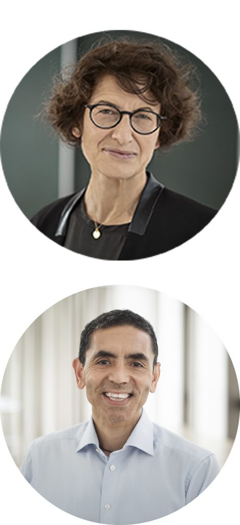 Dr. Uğur Şahin and Dr. Özlem Türeci are physicians, immunologists and cancer researchers whose mRNA research led to creating the first COVID-19 vaccine in collaboration with Pfizer. Dr. Sahin and Dr. Türeci developed the Pfizer vaccine in an unprecedented eleven-month timeframe, enabling many across the globe to defend themselves against COVID-19 quickly.