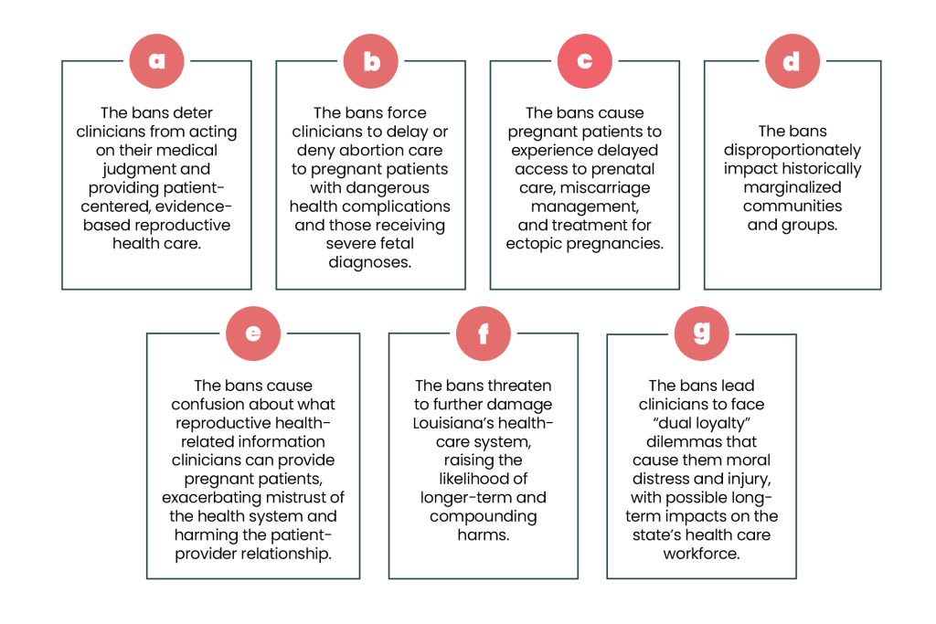 The findings contained in this report are alarming: the research shows how Louisiana’s abortion bans violate federal law meant to protect patients, disregard evidence-based public health guidance, degrade long-standing medical ethical standards, and, worst of all, deny basic human rights to Louisianans seeking reproductive health care in their state. The research makes clear that: