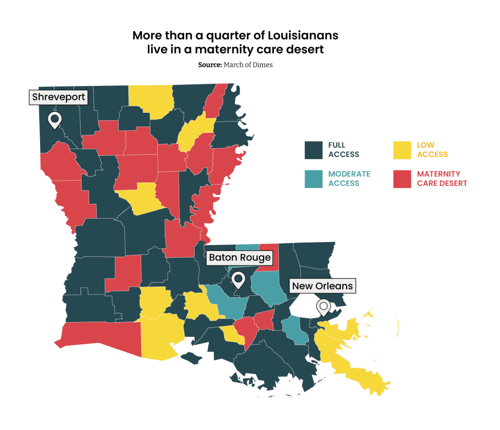 The maternal health crisis in Louisiana is exacerbated by inadequate access to care and a shortage of available providers.
