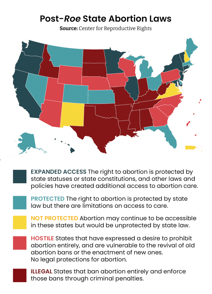 On June 24, 2022, the U.S. (U.S.) Supreme Court ruled in Dobbs v. Jackson Women’s Health Organization (Dobbs) to reverse nearly 50 years of legal precedent recognizing and protecting a federal constitutional right to abortion.[1] For the first time in its history the Court took away a fundamental right.[2] The Dobbs decision overruled Roe v. Wade (Roe), which recognized that the U.S. Constitution guarantees the right of every person to decide whether to continue or end their pregnancy prior to viability without government interference.[3] In their first full state legislative sessions after the Court cleared the way for legislatures to ban abortion entirely, anti-abortion lawmakers across the country introduced over 500 bills to ban or limit legal access to abortion.[4] As of March 2024, 14 states have now criminalized abortion—many of them in the South and Midwest—leaving nearly a quarter of the U.S. population without access to abortion in their state.[5]