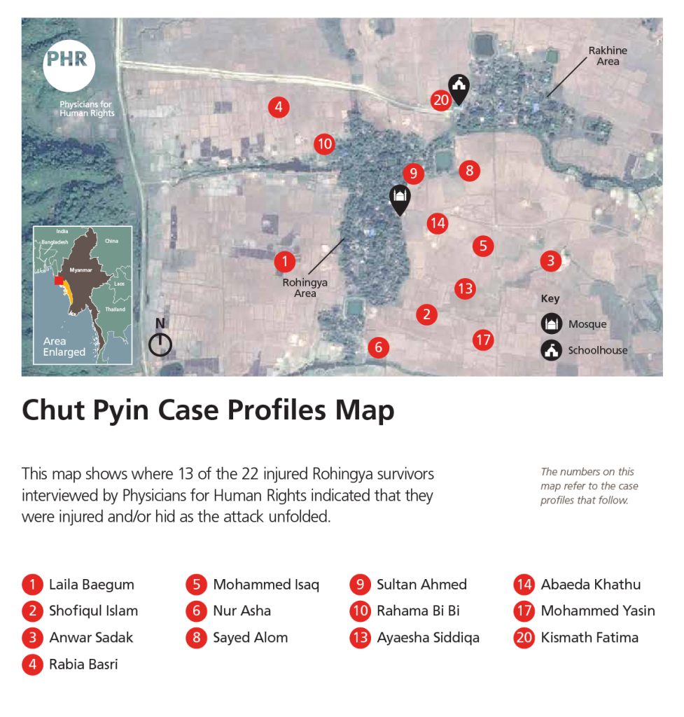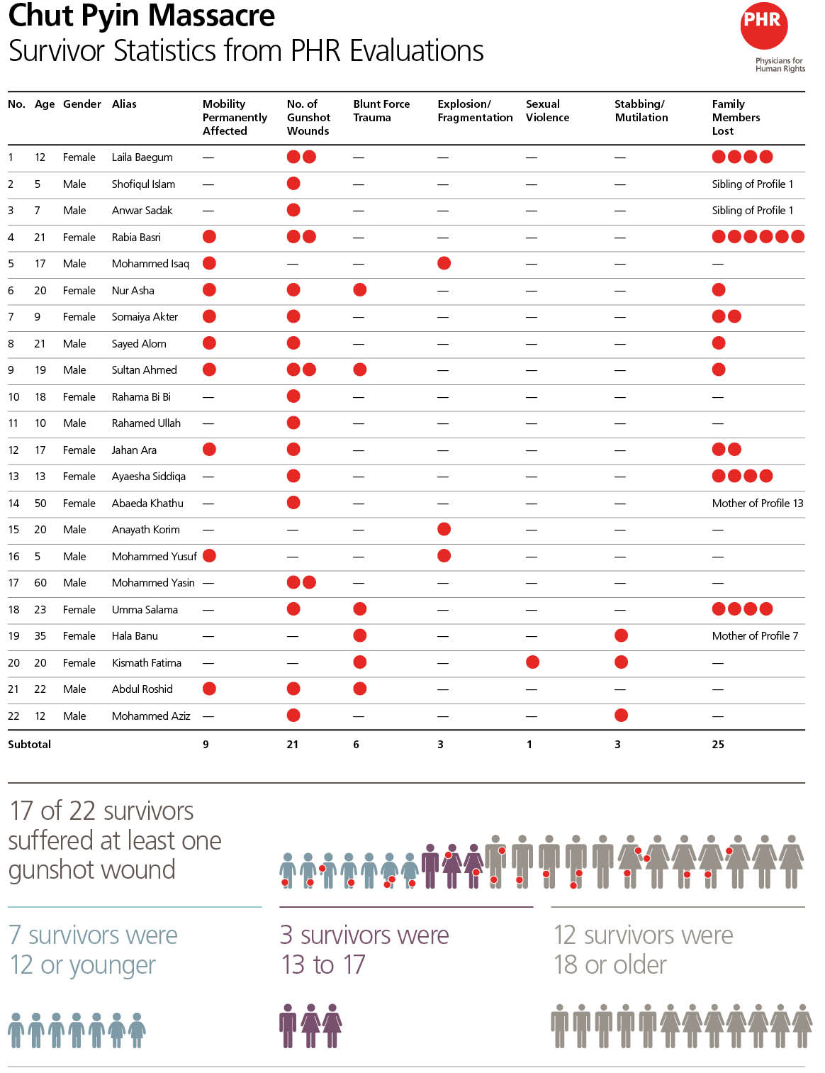 Of the 25 Chut Pyin villagers whom Physicians for Human Rights (PHR) interviewed, 22 had physical injuries and underwent a forensic examination; three additional testimonies came from witnesses and served as background information.