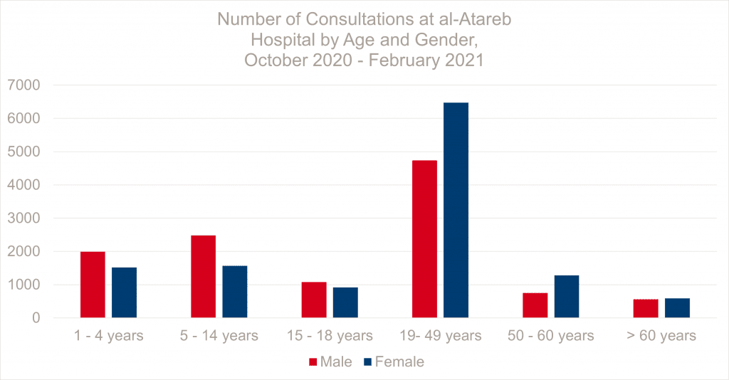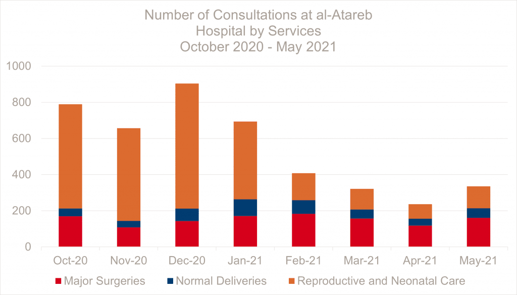 Al-Atareb hospital remained closed for two weeks until the building was repaired. The vaccination clinic and primary health care center were closed for a week. Even after the hospital reopened, services were not fully restored due to security concerns and the fear of new targeting. The hospital’s administration initially prioritized emergency services but did not restore elective care until a week after the reopening. Many patients were hesitant to visit the hospital to seek advanced care or inpatient services, leading to a decrease in service utilization. However, the services that the hospital provided were so important to the community that utilization picked up over time. The number of consultations dropped to 3,049 in April 2021 and to 4,225 in May 2021 (Monthly average of 3,637 for the two months), well below the average number of consultations prior to the attack (4,791 consultations). The reduction was most pronounced for reproductive and neonatal care, indicating that the impact was greatest for women.