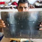 An X-ray of Tamir’s left lower leg, which was examined by PHR doctors, shows a fully intact bullet still lodged in the soft tissue of the knee. The X-ray indicates a shattered fibula, a fractured tibia, and a fully intact bullet that can be seen still lodged in the soft tissue of his knee. Due to his injuries, Tamir is unable to walk or bear any weight.