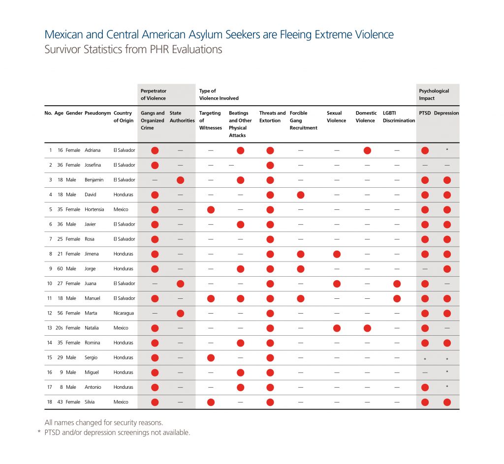 This report examines the cases of 18 asylum seekers (15 adults, three minors) from Mexico and Central America: El Salvador (seven), Honduras (seven), Mexico (three), and Nicaragua (one). While not meant to be a representative sample, these cases provide a snapshot of these asylum seekers’ lives and histories, why they undertook treacherous journeys to seek protection in the United States, and the physical and psychological impact that their experiences have had on them. All of the evaluated asylum seekers provided credible accounts and corroborating evidence that they fled persecution resulting in significant trauma. Several of these asylum seekers endured multiple forms of persecution and trauma, reflecting the compounding violence in several countries that drives so many from this region to seek asylum.