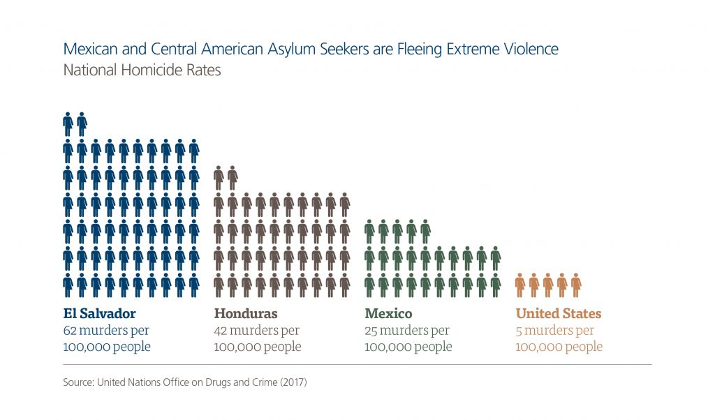The Trump administration has decried the U.S. asylum system as an immigration “loophole” that is “being gamed,” suggesting that those who seek asylum do not have a well-founded fear of persecution, [12] and that the asylum system itself acts as a pull factor for migration. However, this narrative ignores violence and failed governments who are unable or unwilling to protect their people as a major factor pushing asylum seekers in Mexico and Central America. Despite a recent drop in homicide rates, El Salvador remains one of the most violent countries in the world, with 62 murders per 100,000 people, [13] almost 12 times the U.S. rate. Two thirds of these murders are gang-related.[14] While Honduras halved its homicide rate in 2018, it still stood at 42.8 per 100,000 people in 2017, [15] and eight violent massacres took place in the country in the first two weeks of 2019 alone. [16] Similarly, Mexico also experienced the deadliest year on record in 2018 [17] and the first three months of 2019 showed a 10 percent increase in homicides when compared to the same period in 2018. [18] Finally, the Nicaraguan government’s crackdown on the opposition in the form of arbitrary arrests, killings, beatings, torture, and sexual assault has forced at least 60,000 people to flee the country since April 2018. [19]
