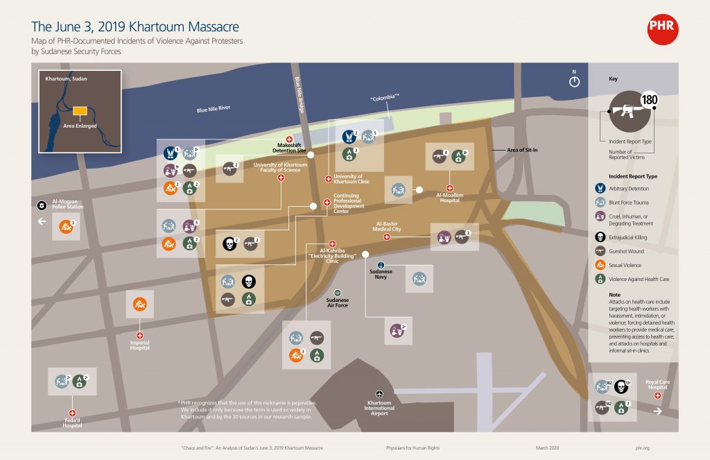 Physicians for Human Rights’ (PHR) investigation into the violations that occurred on June 3 focused on: the nature of the injuries and other physical trauma resulting from events on June 3, 2019 in Sudan; patterns in the testimonies of interviewees and medical evidence to assess allegations of a systematic, widespread, and premeditated campaign of human rights violations by Sudanese security forces; and to what extent, if at all, security forces targeted health workers for detention and ill-treatment due to their emergency medical response and other efforts to support the provision of medical care for injured pro-democracy protesters. These issues are central to the discussion among citizens, democratic forces, and human rights defenders in Sudan, where the new transitional government has formed a national commission to investigate the violence. Victims’ families and survivors of these and other serious violations await truth and accountability.