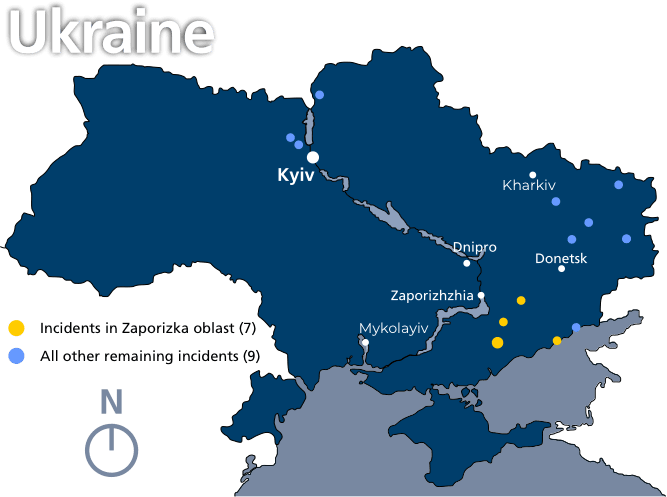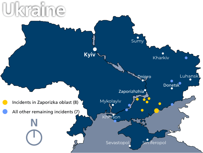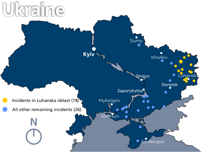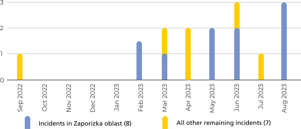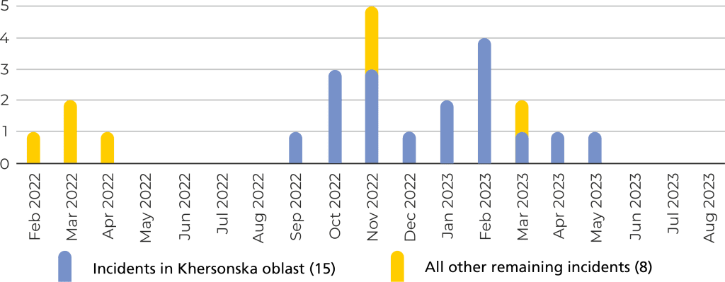 Most of these incidents were documented in Luhanska oblast, where 18 cases were recorded, with most taking place between December 2022 and May 2023. Incidents were also common in Zaporizka oblast with 10 and Kherson with seven. Of note: