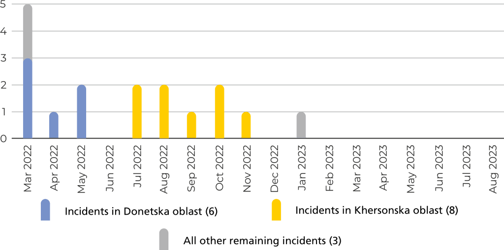 Such incidents were more frequently reported between October 2022 and March 2023, with three incidents reported as taking place during the first two months of the full-scale invasion.