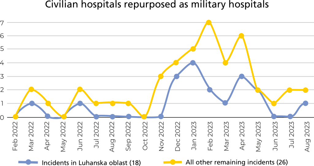 • In March 2023, a hospital in Luhanska oblast was reportedly turned into barracks for Russian soldiers (incident 37605).[55]