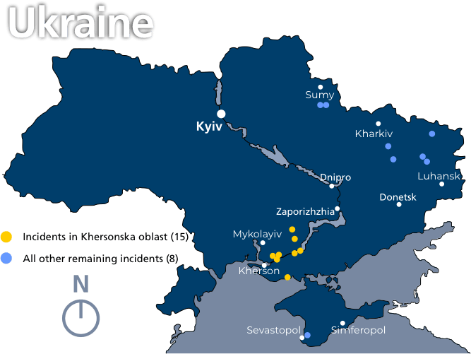For the purpose of this study, Russian-occupied territories were defined within the framework established by the Ministry of Reintegration of the Temporarily Occupied Territories of Ukraine, including territories that were occupied and have since been liberated by the Ukrainian forces and territories that are still under occupation.[20] A case-by-case decision as to whether an incident occurred in an occupied territory was taken based on the best available information at the time.