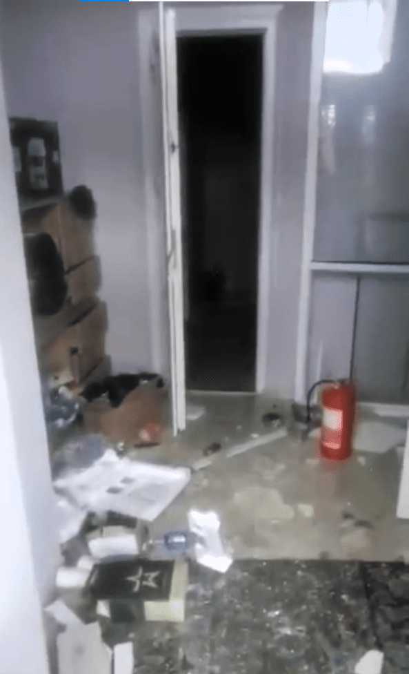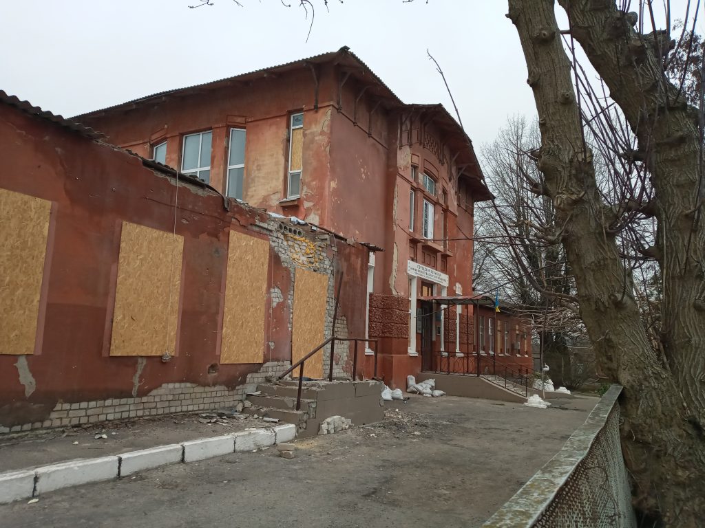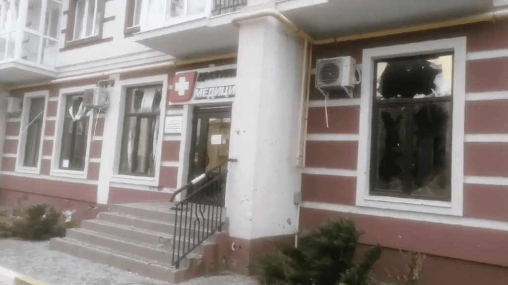 The facade of the damaged Hostomel Primary Care Center. April 2022. Screenshot from a video provided by a hospital representative.