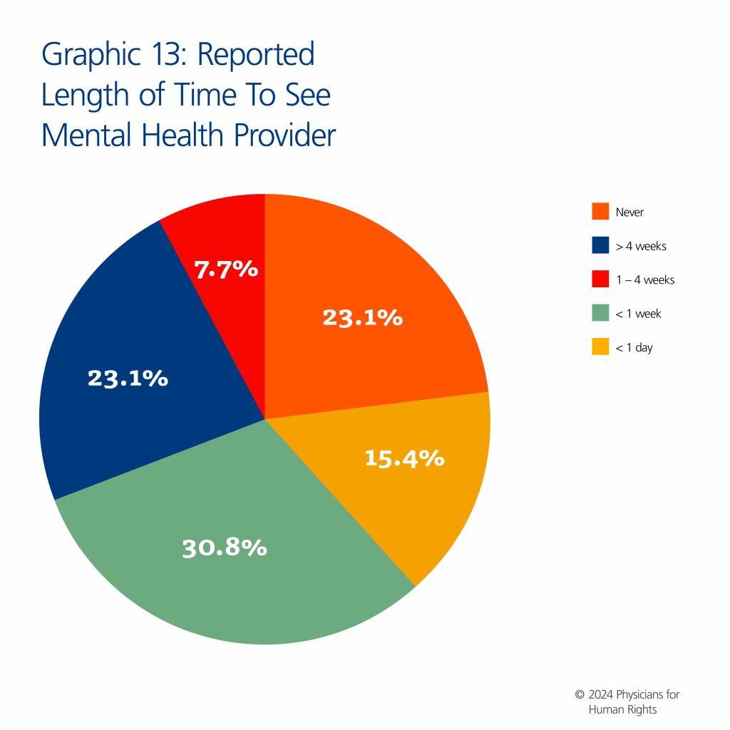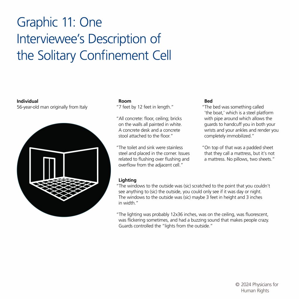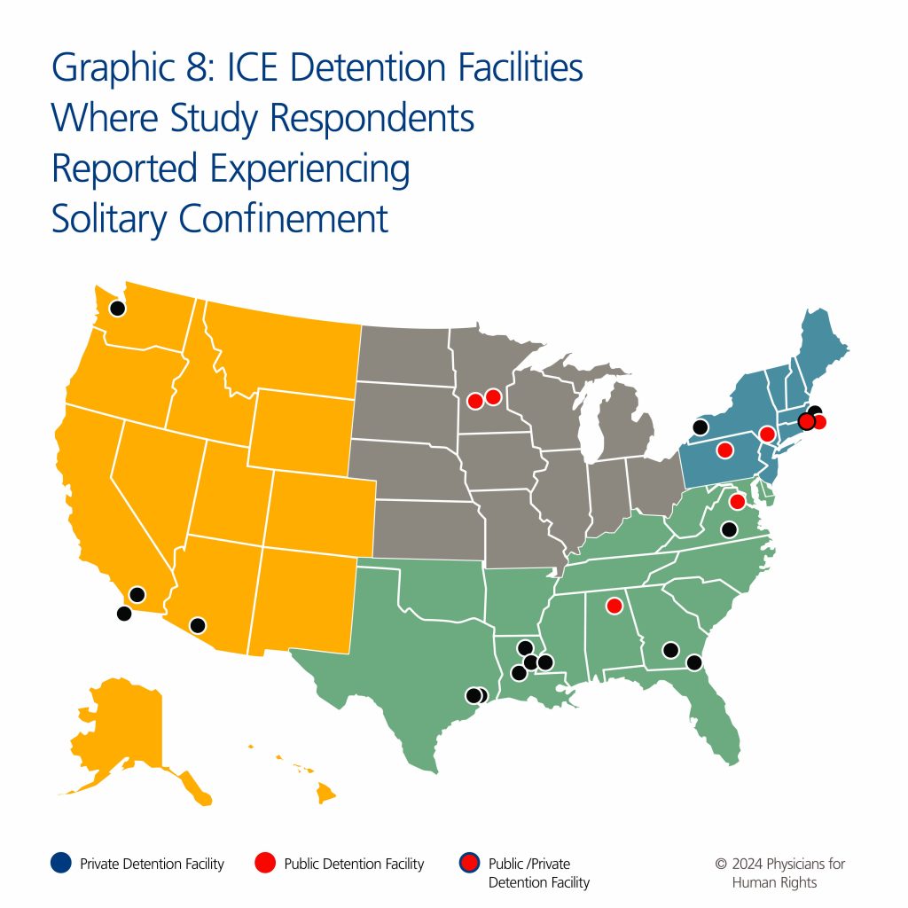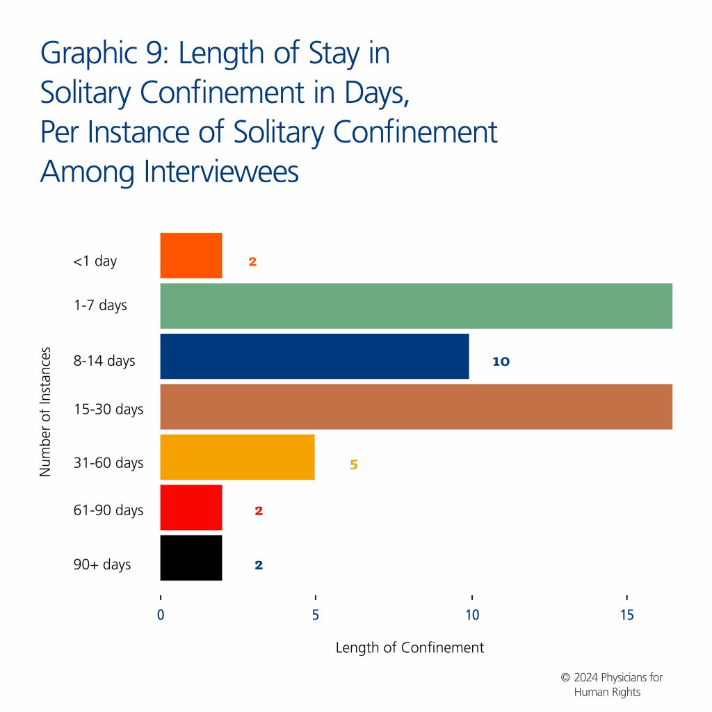 The data presented in the report represent the reported experiences of 26 people held in immigration detention in a limited number of facilities across the United States. Given the study’s modest sample size, we do not capture the full range of experiences of ICE-detained people experiencing solitary confinement in the United States. Additionally, some facilities were only known to the participants by their state location rather than the city, so it was not possible to know how many distinct facilities were represented. The interview portion of this study may also suffer from sampling bias in that attorneys may have only referred specific participants whom they felt would be comfortable participating. Participants sometimes referred friends they had made while in detention together, representing additional sampling bias. Although this study did not include a language restriction, lawyers may have been more likely to refer clients with whom they could communicate more easily without the use of an interpreter. This data was also subject to potential recall bias, as responses were based on participant memory of detention conditions. There was potential for variation in interview style among interviewers, but care was taken to minimize this variability through extensive interviewer training before and during the study period and by including at least two staff members per interview (one interviewer, one recorder) for each interviewer’s first interview. The use of a structured questionnaire with consistent wording was designed to reduce interviewer bias. Prior to publication, the authors of this report had the opportunity to present the findings to key personnel in DHS and ICE.