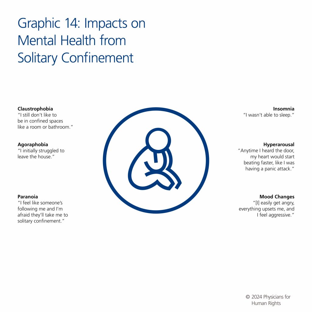 Solitary confinement causes a range of adverse health effects, including post-traumatic stress disorder (PTSD), self-harm, and suicide risks. Prolonged confinement can lead to lasting brain damage, hallucinations, confusion, disrupted sleep, and reduced cognitive function. These effects persist beyond the confinement period, often resulting in enduring psychological and physical disabilities, especially for people with preexisting medical and mental health conditions or other vulnerabilities.