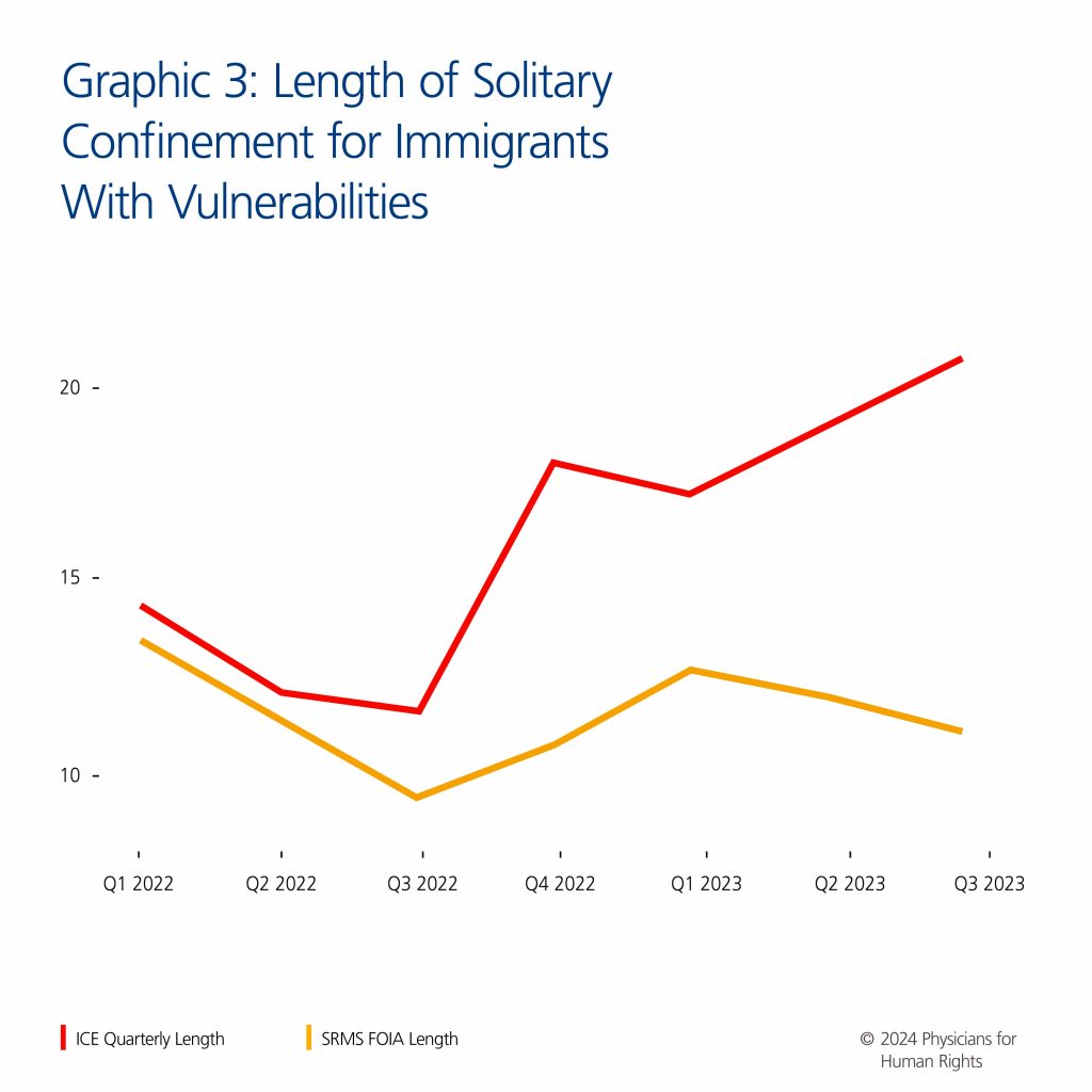 Inconsistencies with SRMS data continue as data that ICE has only made publicly available for 2022 and 2023 reflects. Comparisons between publicly published quarterly ICE aggregate statistics from 2022 and 2023[60] and data HLS obtained through FOIA litigation[61] revealed a substantial underreporting in the number of placements and length of solitary confinement of vulnerable populations reflected in the FOIA SRMS data.[62] According to the publicly available ICE data, there are up to twice as many placements of vulnerable immigrants in solitary confinement during 2022 and 2023 than reflected in the FOIA SRMS data.[63] In addition, the publicly available ICE data for 2022 and 2023 show that the number of placements of vulnerable immigrants in solitary confinement is increasing at a faster rate than the number reflected in the FOIA-obtained SRMS data.[64]