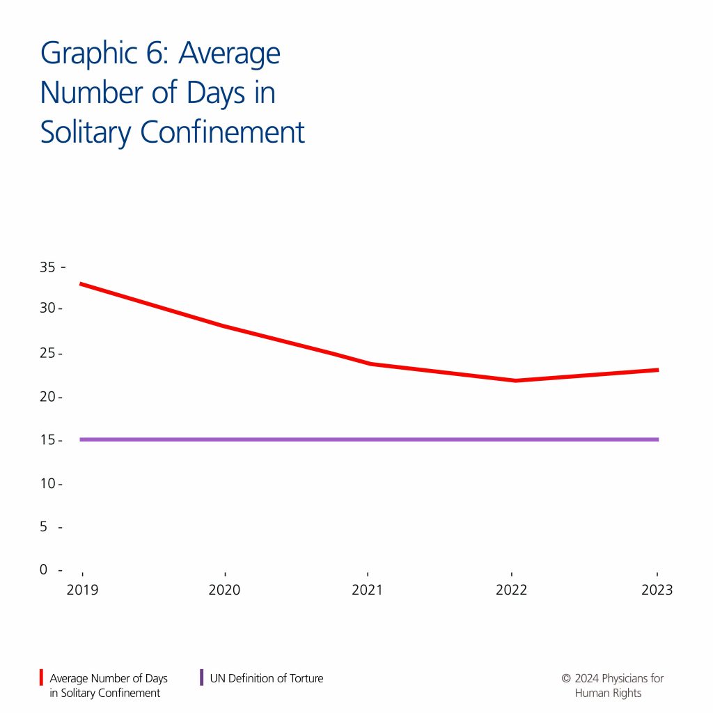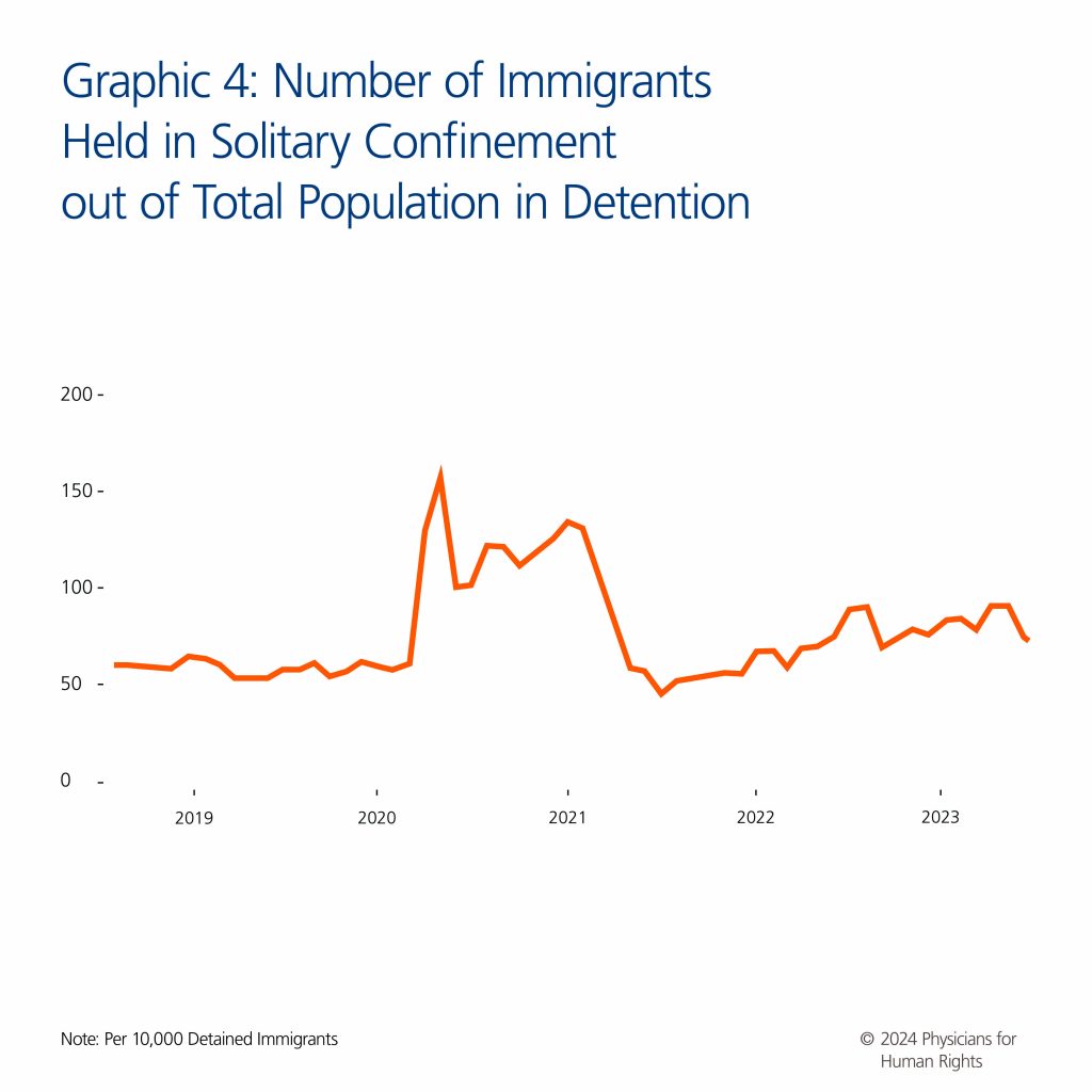 These concerns are longstanding. In 2012, PHR, in partnership with the National Immigrant Justice Center, published a report on solitary confinement in ICE detention, “Invisible in Isolation: The Use of Segregation and Solitary Confinement in Immigration Detention.”[46] That report demonstrated how solitary confinement of people in ICE custody was applied arbitrarily, inadequately monitored, harmful to health, and a violation of their due process rights.