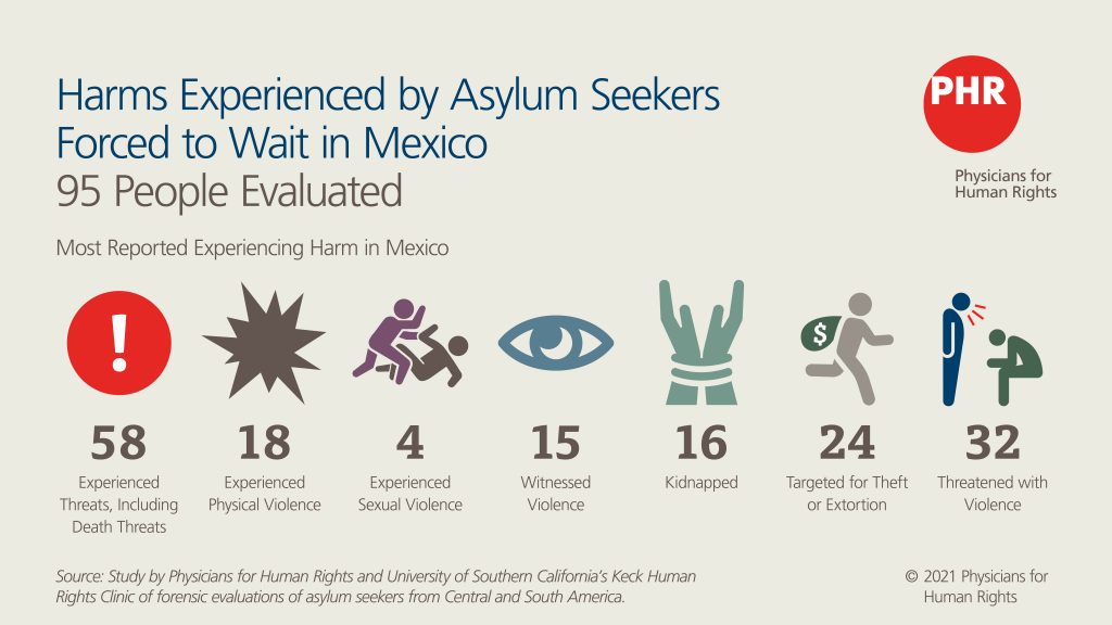 Considerable evidence indicates thatit is not safe for migrants to remain in Mexico while they await the determination of their U.S. asylum status. Bona fide refugees, seeking asylum in the United States, have faced severe harm and violence in Mexico as a result of the so-called Migrant Protection Protocols (MPP), which violate established international human rights and U.S. law. Resilient people fleeing harm have been forced to expose themselves to further harm. These traumatic experiences compound the trauma experienced in their home country and have had a significant negative impact on their physical and mental health. Vulnerable people, including those with significant medical conditions and small children, have also been subjected unnecessarily to inhumane conditions, including lack of food and housing insecurity, as well as lack of access to medical care and exposure to extreme weather conditions. Moreover, at least 11 people in Physicians for Human Rights’ data set belonged to categories which should have exempted them from being enrolled in MPP in the first place, and at least one third of those evaluated had a stable and safe living plan in the United States with family and friends. Ultimately, the asylum seekers in this study chose to continue waiting in Mexico because, as our data indicates, the dangers they faced in their home countries were even greater. Forcing people to make this dangerous choice is heinous, and it is also a violation of obligations under U.S. and international law.