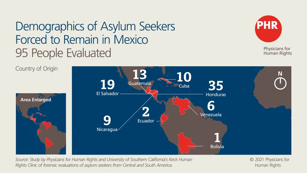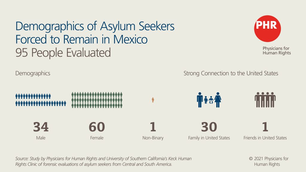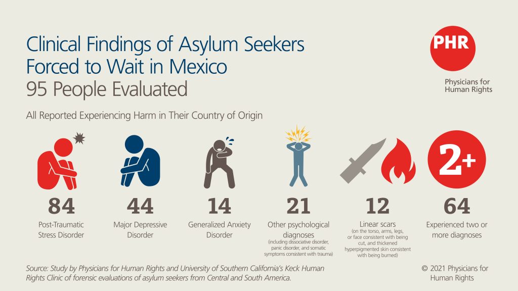 Since the start of MPP, Physicians for Human Rights (PHR) has responded to more than 100 requests by attorneys for pro bono forensic evaluations of asylum seekers enrolled in the program, most in support of asylum claims and a few in support of requests for MPP exemption due to health issues. To quantify the extent of reported health and human rights violations affecting asylum seekers in MPP, PHR partnered with the University of Southern California’s Keck Human Rights Clinic (KHRC) to review 95 deidentified affidavits based on forensic evaluations of asylum seekers from Central and South America ranging in age from 4 to 67 years. We found that at least 11 people belonged to categories that should have been exempt from MPP enrollment. Although most affidavits focused on the harms migrants fled in their home countries, most documented compounding harms to the migrants after they were returned to Mexico under MPP, including physical violence, sexual violence, kidnapping, theft, extortion, threats, and harm to family members. The affidavits also reported unsanitary and unsafe living conditions, poor access to services, family separations, and poor treatment in U.S. immigration detention. Nearly all of those evaluated were diagnosed with post-traumatic stress disorder, and many exhibited other debilitating psychological conditions or symptoms.