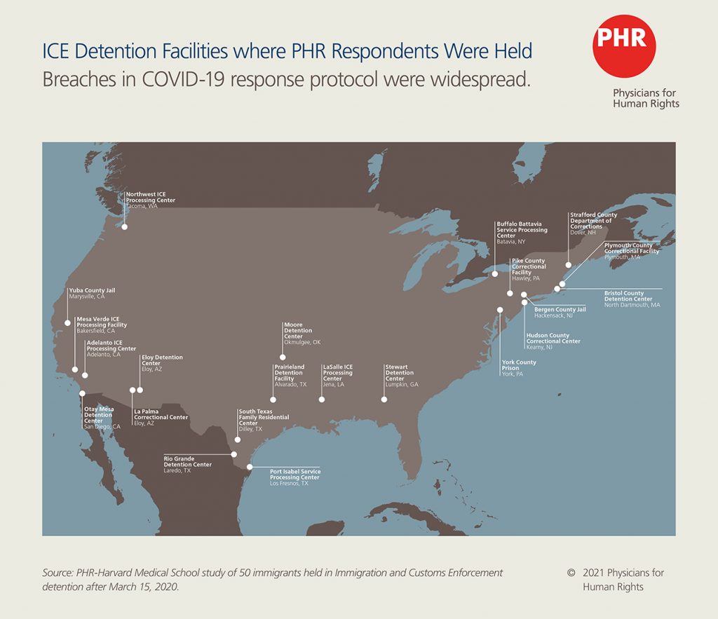 In April 2020, the United States held more than 56,000 people in 220 immigration detention facilities across the country in what has become the largest immigration detention system in the world[1] – a far cry from the 7,475 people who were held in U.S. immigration detention in 1995.[2] Xenophobia and discrimination against Black and brown immigrants have been driving factors in the increase in the immigration detention population, a manifestation of the systemic racism that has also driven mass incarceration in the United States.[3] Expansion of immigration detention accelerated under the presidency of Donald Trump, whose administration opened numerous government-run detention centers and increased the number of contracts with private for-profit companies to operate additional facilities.[4] Immigration and Customs Enforcement (ICE), the federal agency that runs these facilities, has long been accused of human rights violations, physical and psychological abuse, inadequate medical care leading to otherwise preventable health crises, and deaths in custody. Additionally, previous badly contained infectious disease outbreaks all point to “systemic failures of healthcare provision and government oversight.”[5],[6] In fact, independent medical review of detainee death reports concluded that in 8 out of 15 reported deaths in ICE custody between December 2015 and April 2017, medical negligence was a contributing factor.[7] In 2020, as the COVID-19 pandemic spread across the country, it became clear that ICE’s continued negligence, coupled with the vast expansion of immigration detention, would likely lead to a public health disaster.[8]