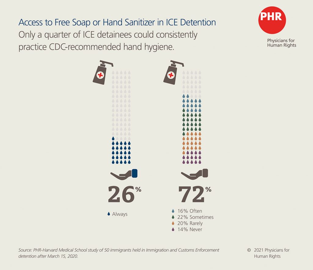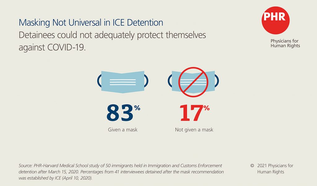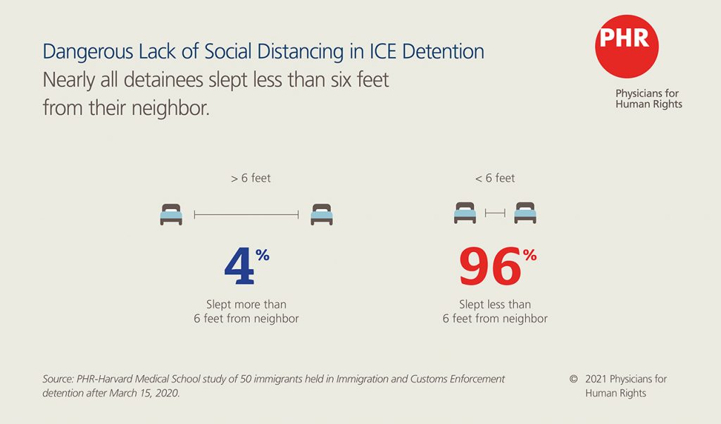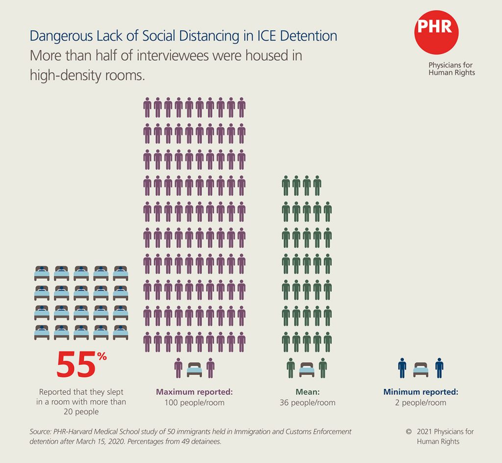 Given the lack of transparent data and the severe health risks in congregate settings caused by the pandemic, PHR and Harvard Medical School faculty and students sought to document conditions experienced by people recently released from immigration detention. These interviews uncovered significant failures in the agency’s handling of the virus within its detention facilities, creating dangerous conditions and leaving immigrants with no recourse to protect themselves.
