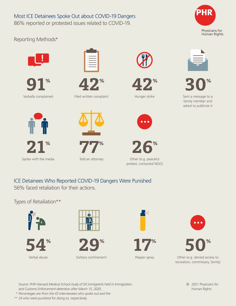 Forty-three study participants (86 percent) stated that they reported and/or protested about issues related to COVID-19, including verbally complaining to staff about unsanitary conditions or lack of personal protective equipment, filing formal grievances, going on hunger strikes, reporting conditions to lawyers, reporting conditions to the media, and sending messages to family members with the hope they would be publicized. Of these 43 who protested, 56 percent (24 people) reported experiencing acts of intimidation and retaliation after their complaints, including verbal abuse by detention facility staff, being pepper sprayed, being placed in solitary confinement, and experiencing threats or actions of limiting food, communication, or commissary access.