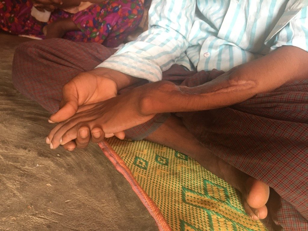 Abu Tayub (Profile 25), a 25-year-old farmer from Gu Dar Pyin, was fleeing approaching Myanmar security forces on August 25, 2017 when he was hit by the blast from a landmine. The explosion killed five other fleeing villagers around him and seriously injured his left arm. He hid in the forest for three days before traveling to another village, where somebody helped him bandage his wound. After seven days there, he traveled to Bangladesh, where he was sent to a hospital and received skin grafts. He has lost all function in his left hand, likely rendering him unable to perform many of his previous farming activities. “I used to be a hard laborer,” said Tayub. “I can’t work now, I can’t even lift the small water pot that is used at the latrine…. I feel so sorry that I can’t use my hand anymore.”[51]