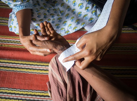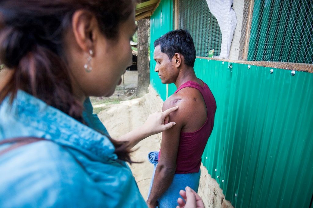 PHR Medical Expert Dr. Rohini Haar examining Fozol Korim in Balukhali refugee camp in Bangladesh. He suffered nerve injury after being shot in the back while fleeing Myanmar security forces and can no longer perform basic tasks using his arm.