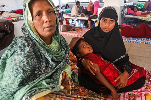 Muriam Kathu, 5, with her mother and grandmother. Muriam suffered neurological damage when Myanmar security forces brutally assaulted her and is unable to walk, play, or even sit up.