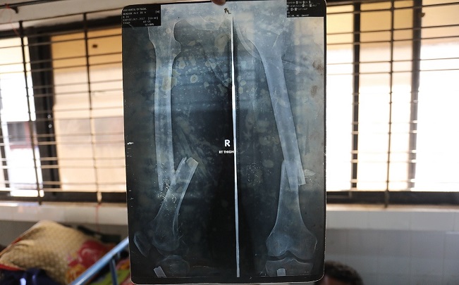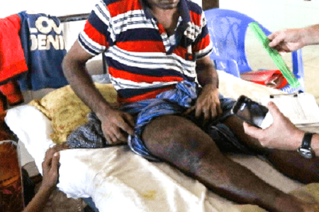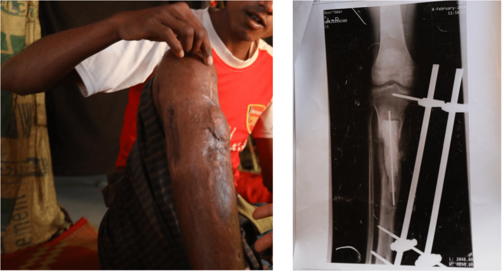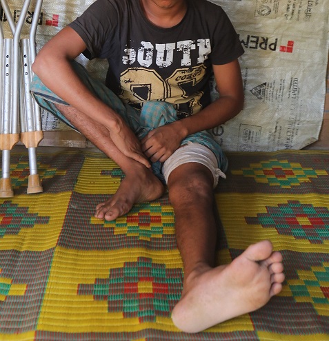 Fozol Ahmed’s legs were broken in multiple places when four or five Myanmar security forces bound him and severely beat him with their rifle butts. His right leg is now considerably shorter and thicker than his left leg, he has difficulty walking, and cannot do so without pain.