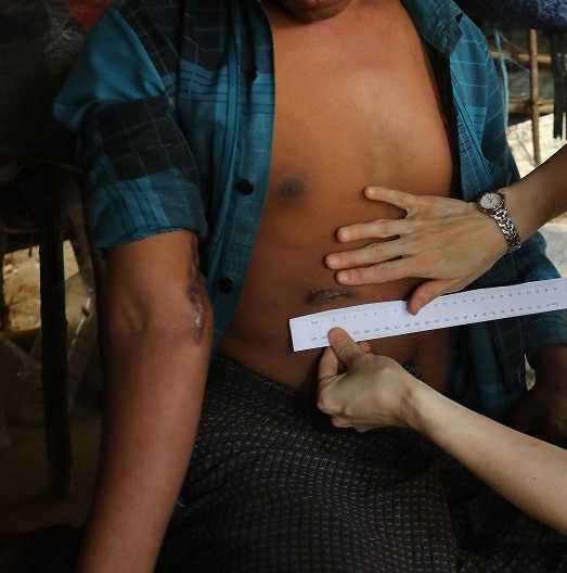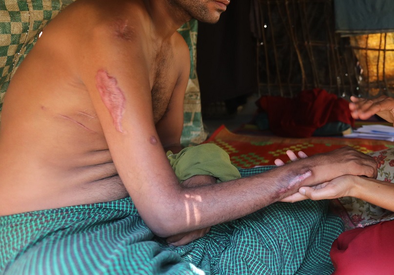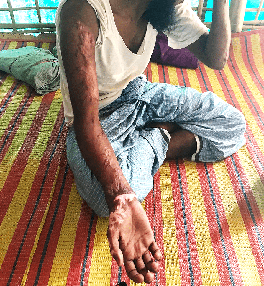 Faizal Islam (Profile 27) was a 28-year-old farmer who lived with his wife and two children in the village of Pa Da Kah Yua Thit. On August 25, 2017, he saw Myanmar security forces entering the area. Villagers were shot at as they ran. Islam ran with the others and was shot in his left hand, but he was able to hold onto the wound and keep running until he reached the forest, where he stayed for six days before setting out for Bangladesh. Despite receiving immediate medical attention in Bangladesh, he has lost basic motor function in his left hand, rendering him unable to grasp and hold onto objects of any size or weight.