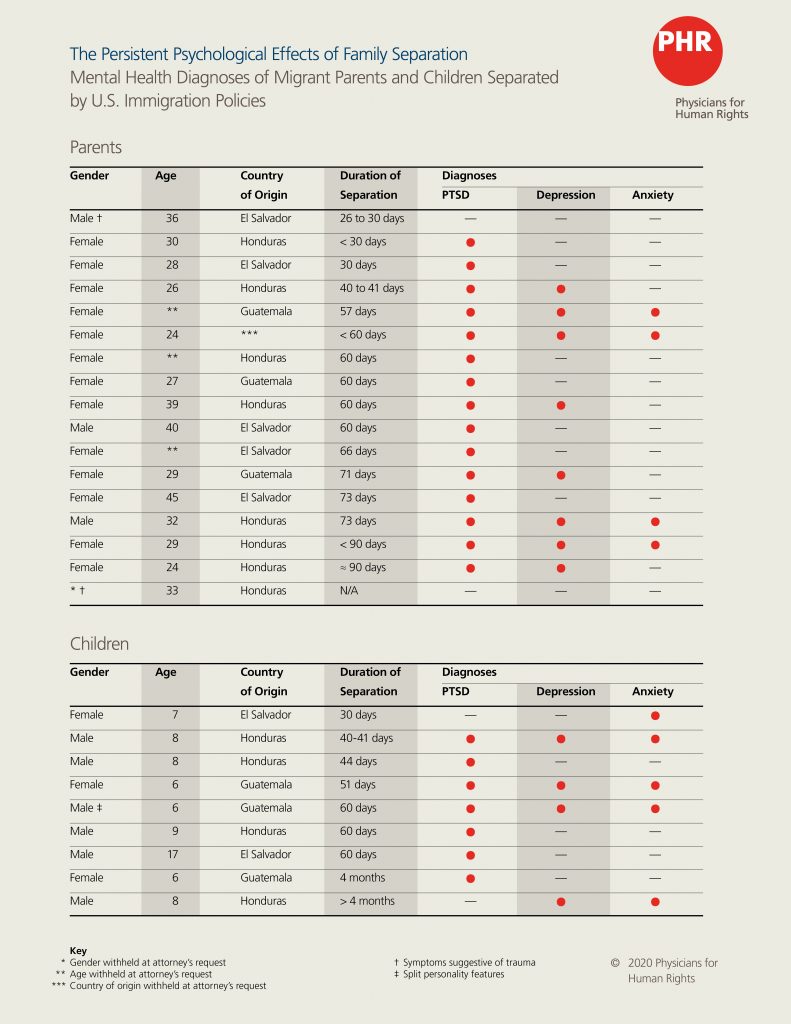 A new Physicians for Human Rights (PHR) investigation, based on psychological evaluations of asylum-seeking parents and children who were separated by the U.S. government in 2018, found pervasive symptoms and behaviors consistent with trauma; most met diagnostic criteria for at least one mental health condition, such as post-traumatic stress disorder, major depressive disorder, or generalized anxiety disorder consistent with, and likely linked to, the trauma of family separation.