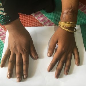 As the attackers swarmed into Chut Pyin, Hala Banu’s (Profile 19) family tried to escape out the back of their house, but her husband and six-year-old son were shot dead just steps away. Hala’s nine-year-old daughter, Somaiya (Profile 7), was shot in the leg and couldn’t run; she lay bleeding by the bodies of her father and brother as security forces struck Hala in the face with a metal rod and dragged her away to the schoolhouse. At the school, Hala found women screaming and crying. She saw two women being raped, and the baby of one of the victims being thrown into a fire. After her attackers forced Hala to turn over her jewelry, they stabbed her with a knife attached to the end of a gun. She managed to run out of the building and back to her home, where she found Somaiya still alive. Mother and daughter were finally rescued and taken to a nearby village. From there, they set out on an arduous 12-day walk to Bangladesh, Somaiya’s older brother and a cousin carrying her in a blanket through heavy rains and mud up to their thighs.
