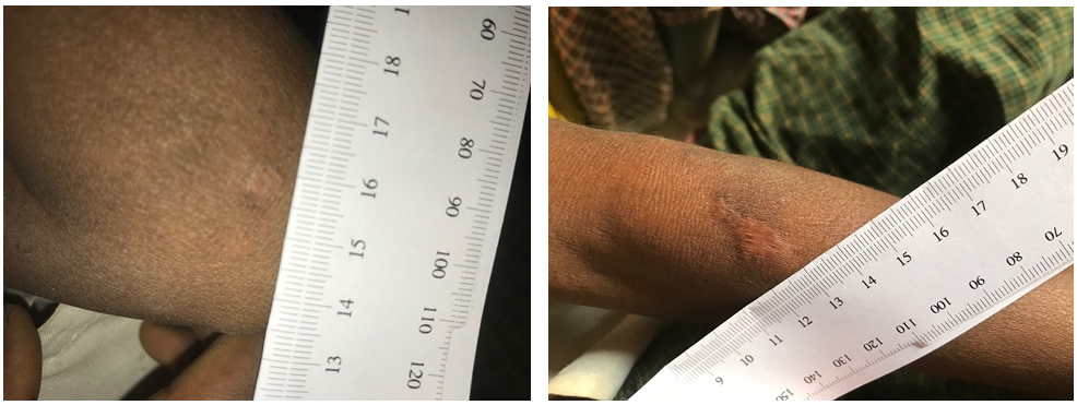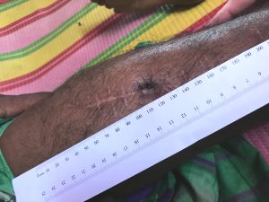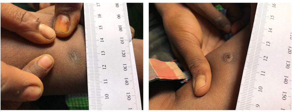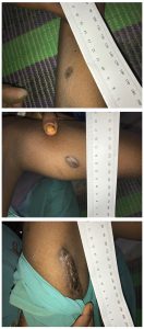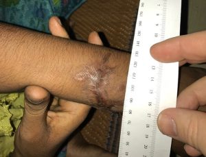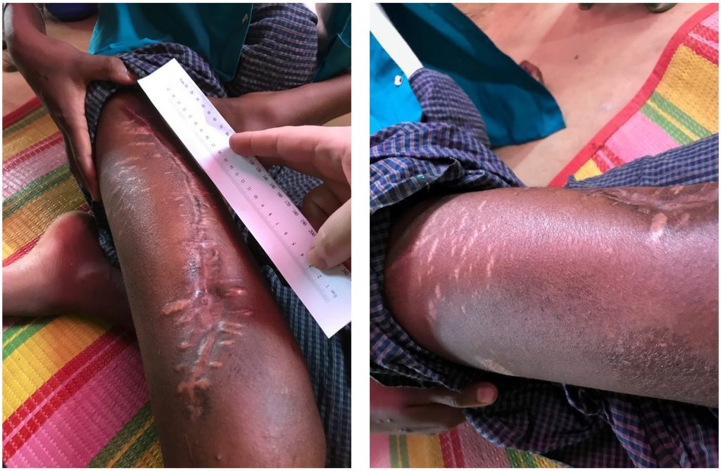 PHR’s physical findings suggest that these two survivors’ injuries could have been caused by the impact of a hand grenade or a launched projectile, such as a mortar or a propelled grenade. Such weapons can cause severe burns, bone fractures, and internal injuries. Shrapnel or other object fragments within the wound, dirt, or other nearby objects may also cause infections that, depending on their severity, can eventually lead to disability.