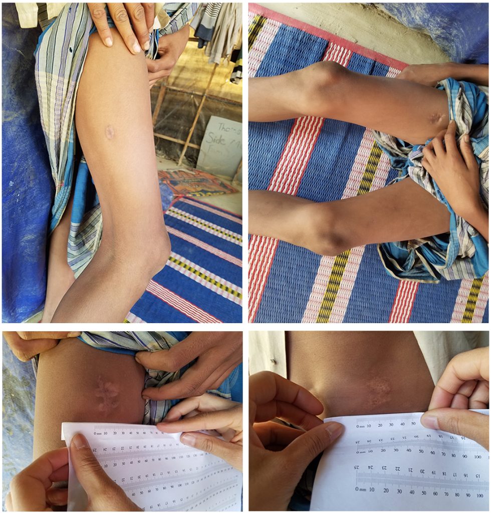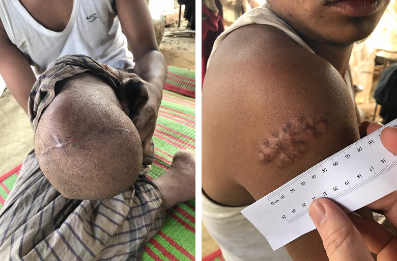 Three people sustained injuries from explosives or fragmented projectiles during the Chut Pyin massacre: Mohammed Yusuf, a five-year-old boy (Profile 16) who permanently lost his sight and hearing on the right side; Anayath Korim (Profile 15), 20, who walks with a limp and has limited joint range of motion due to permanent burn scars; and 17-year-old Mohammed Isaq (Profile 5), who had to be operated on and hospitalized for five months and still walked with crutches six months after the attack.